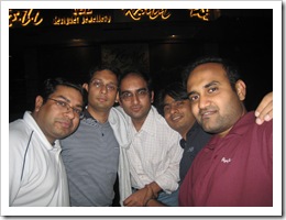 Our (D-14) group mate Vipul won a business plan competition and we all went to Barbeque Nation to celebrate. This was one of the best days since I joined ISB. We had lots of fun, mostly at the cost of Moiz. I have laughed this much for months now. Nice break from the otherwise hectic and stressful schedule. We were the last one's to leave the restaurant. If we had not left for another 10 minutes, we probably would have been thrown out! We pulled each others legs and finally everyone remembered the most memorable moment at ISB. Wow, for the first time I am thinking I am gonna miss this life. Just 120 days to go for graduation!